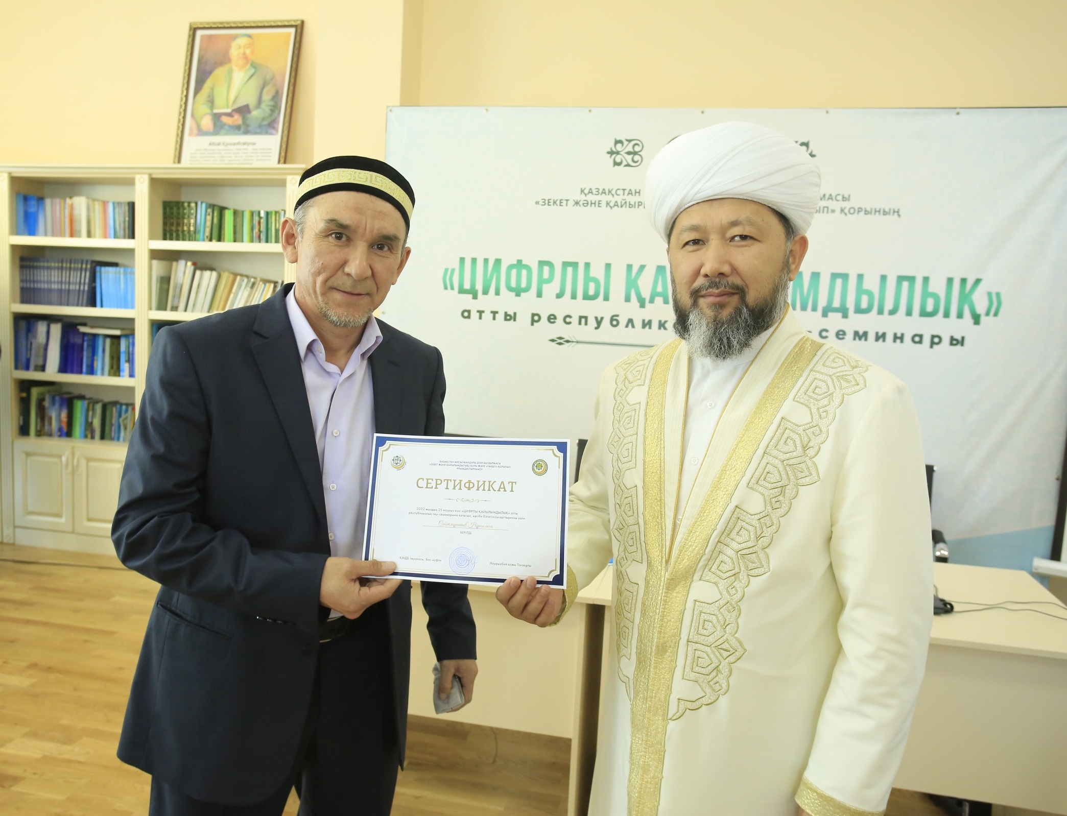 ҚМДБ Төрағасы Наурызбай қажы Тағанұлы «Зекет және қайырымдылық» қоры мен «Уақып» қоры ұйымдастырған «Цифрлы қайырымдылық» тақырыбындағы республикалық оқу-семинарының қатысушыларына сертификат табыстады.
