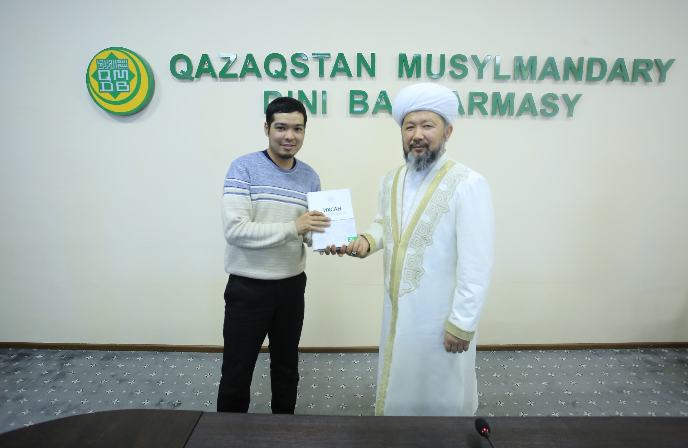 Кездесу соңында ҚМДБ Төрағасы қонақтарға «Muftiyat» баспасында жарық көрген «Ихсан – рухани тәрбие негізі» кітабын сыйға тарту етті.