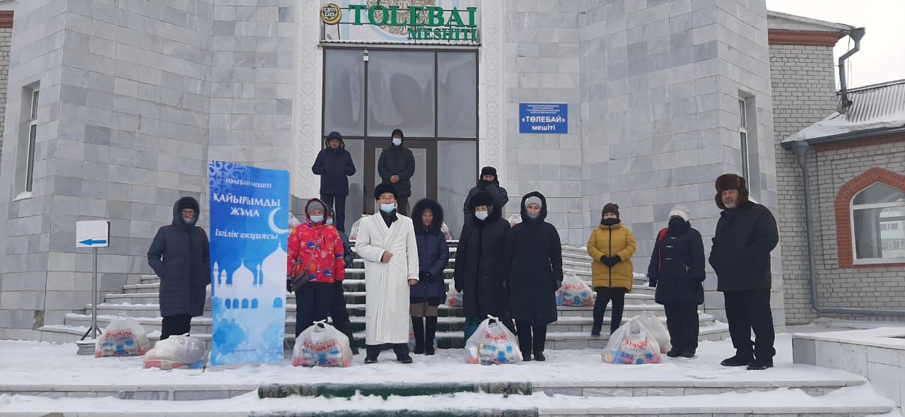 Қазақстан мұсылмандары діни басқармасы Нұр-Сұлтан қаласы өкілдігінің тапсырмасы аясында «Төлебай» мешітінде «Қайырымды жұма» акциясы өтті. Шара барысында 30 мұқтаж отбасыға азық-түлік сөмкелері үлестірілді.